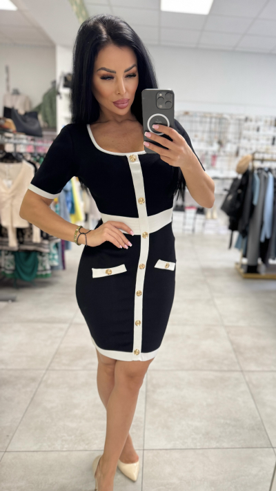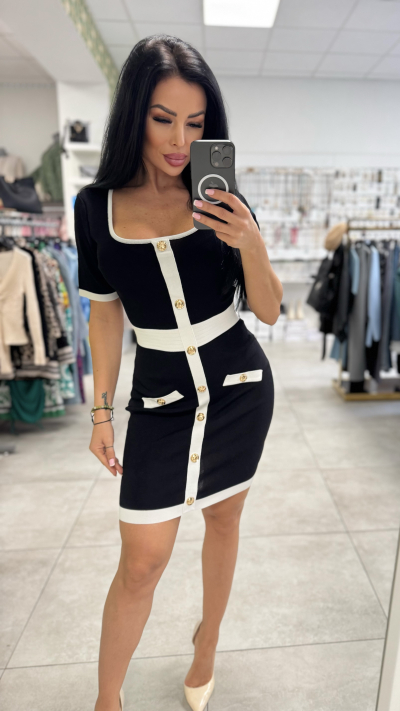 Elegantné univerzálne šaty so zlatými gombíkmi Tieto nadčasové šaty sú ideálnou voľbou pre ženy, ktoré milujú spojenie elegancie a pohodlia. Vyrobené z príjemného, elastického materiálu, ktorý krásne obopne postavu a zvýrazní ženské krivky. ???? Dizajn: Čierne šaty s kontrastným bielym lemovaním a dekoratívnymi zlatými gombíkmi po celej dĺžke. ???? Strih: Pužový strih s krátkym rukávom, ktorý opticky zoštíhľuje a pôsobí veľmi žensky. ???? Detaily: Ozdobné falošné vrecká so zlatým gombíkom dodávajú šatám luxusný vzhľad. ???? Využitie: Perfektné do práce, na obchodné stretnutie, spoločenskú udalosť alebo večerné posedenie. ✨ Univerzálne šaty, ktoré nesmú chýbať vo vašom šatníku – ľahko ich skombinujete s lodičkami aj so štýlovými sandálkami. Materiál: pružný úplet (polyester s prímesou elastanu)