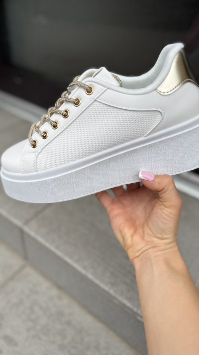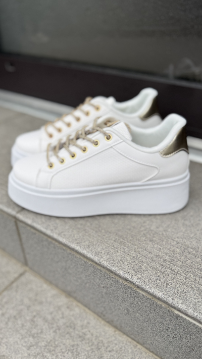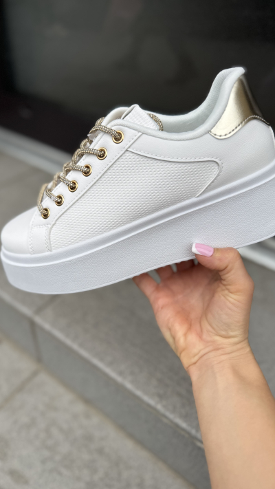 Štýlové tenisky, ktoré dodajú tvojmu outfitu trendový a moderný vzhľad. Biela farba pôsobí elegantne a ľahko sa kombinuje, zatiaľ čo zlatý detail na päte a zlaté očká na šnúrky pridávajú teniskám šmrnc a nádych luxusu.
