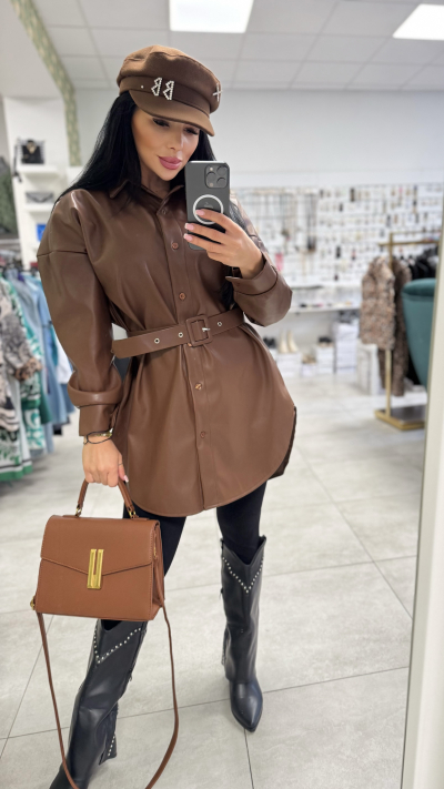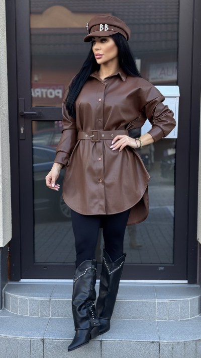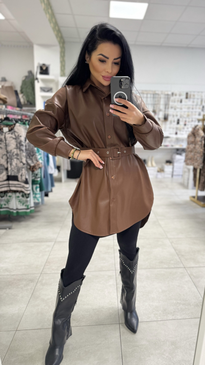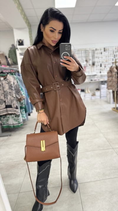 Dámska košeľa šaty z ekokože – hnedá Štýlová košeľa z kvalitnej ekokože, ktorú môžete nosiť ako šaty alebo ako vrchný kúsok k legínam či džínsom. Univerzálna veľkosť s opaskom v páse krásne tvaruje postavu a dodáva moderný vzhľad. Detail produktu: • Materiál: ekokoža (príjemná na dotyk, mäkká, poddajná) • Zapínanie: na gombíky po celej dĺžke • Dlhý rukáv s možnosťou vyhrnutia • Odnímateľný opasok v rovnakom odtieni • Univerzálna veľkosť – vhodná pre S, M, L