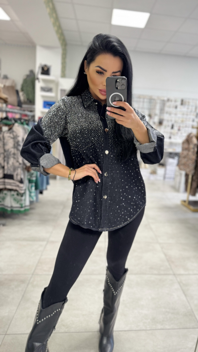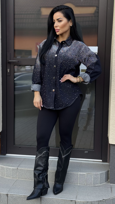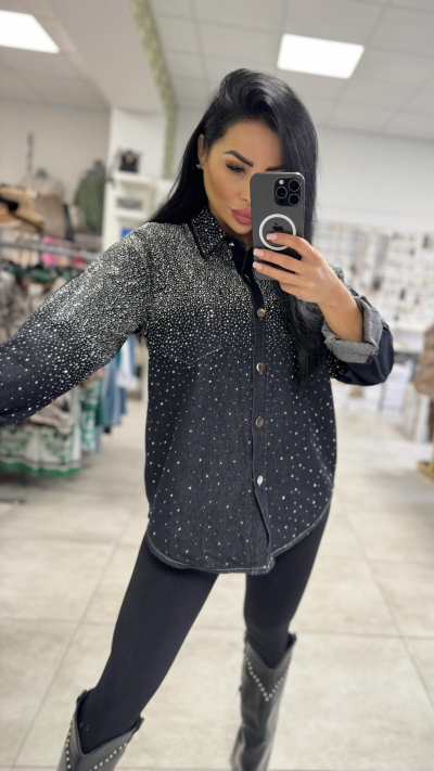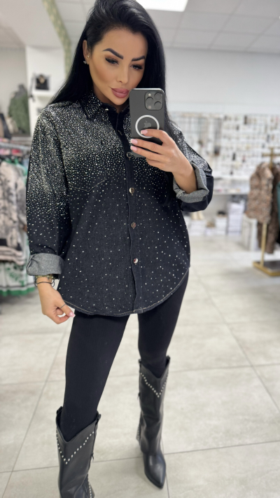 Tmavomodrá džínsová košeľa s kamienkami – univerzálna veľkosť Trendy oversize košeľa, ktorá sa stane dominantou každého outfitu. Je vyrobená z vysoko kvalitných materiálov, čo zaručuje pohodlie aj pri celodennom nosení. Košeľa je zdobená drobnými kamienkami po celej ploche, ktoré jej dodávajú elegantný a štýlový vzhľad. Detail produktu: • Materiál: kvalitná zmes bavlny s prímesou (príjemná na dotyk, pevná a odolná) • Farba: tmavomodrá (denim efekt) • Zapínanie: gombíky po celej dĺžke • Dlhý rukáv s možnosťou vyhrnutia • Drobná kamienková aplikácia po celej ploche • Univerzálna veľkosť – vhodná pre S, M, L, menšie XL