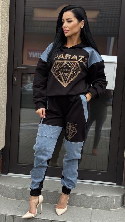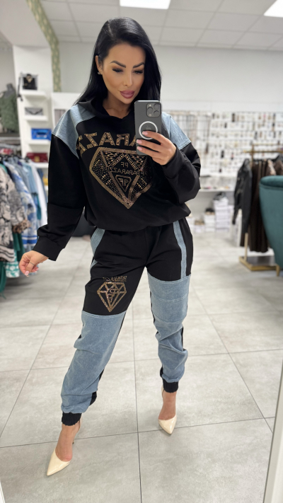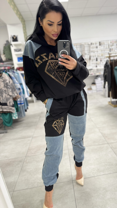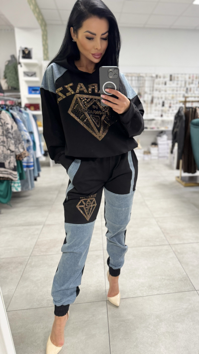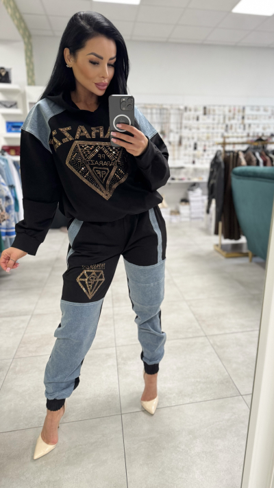 Štýlová, dámska dvojdielna súprava. Súprava je vyrobená v kombinácii 2 materiálov. Krásny kontrast riflovej a čiernej. Súprava je v univerzálnej veľkosti. Skladá sa z mikiny a nohavíc. Perfektný kúsok na voľnočasové aktivity.