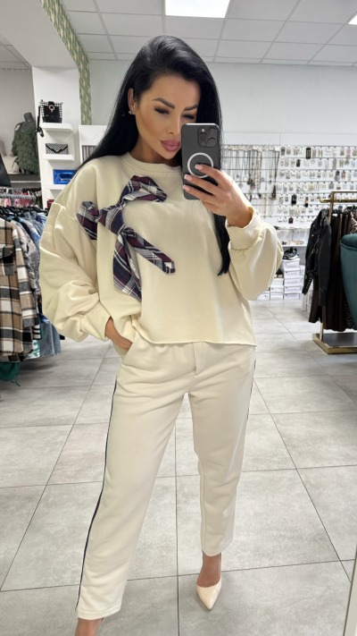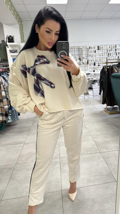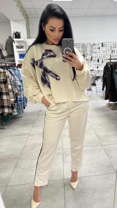 Štýlová dámska súprava v univerzálnej veľkosti. Súprava je bledobežovej farbe. Krásny kúsok vhodný na viacero príležitostí. Mikina je voľného OverSize strihu a Tepláky sú v páse na gumu, takýto kúsok perfektne sedí od S až do L.