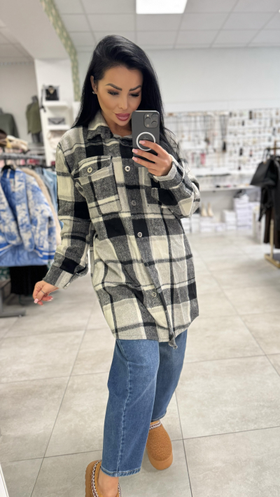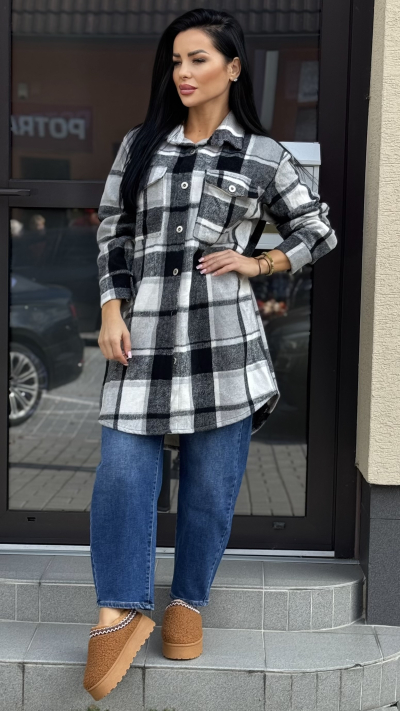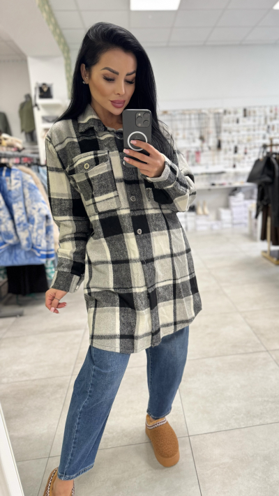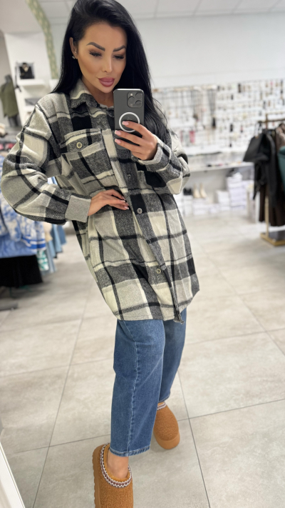 Dámsky prechodný kabátik / oversize košeľa – UNI (bielo-čierno-sivý) Štýlový a pohodlný prechodný kabátik, ktorý perfektne doplní tvoj jesenný či jarný outfit. Vyrobený z mäkkého, hrejivého materiálu s flanelovým efektom. Oversize strih zaručuje voľnosť pohybu a moderný ležérny vzhľad. Môžeš ho nosiť ako ľahký kabátik cez tričko či sveter, alebo ako hrubšiu košeľu. ???? Farba: bielo-čierno-sivá károvaná ???? Strih: oversize / voľný ???? Zapínanie: na gombíky po celej dĺžke ???? Vrecká: dve náprsné vrecká s gombíkmi ???? Materiál: mäkký flanelový mix (polyester / vlna – podľa modelu) ???? Veľkosť: UNI – vhodná pre veľkosti S až L