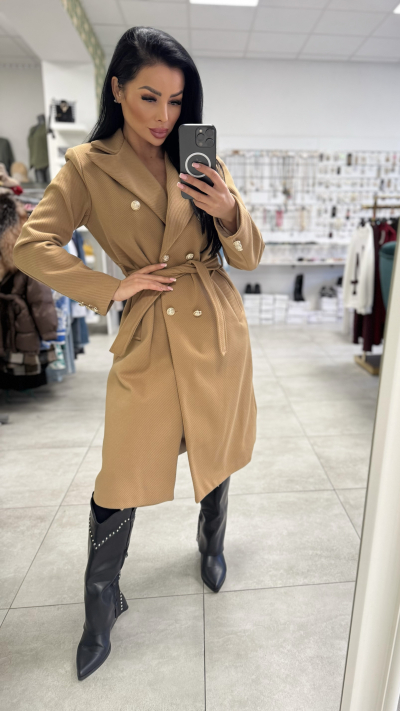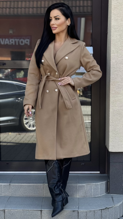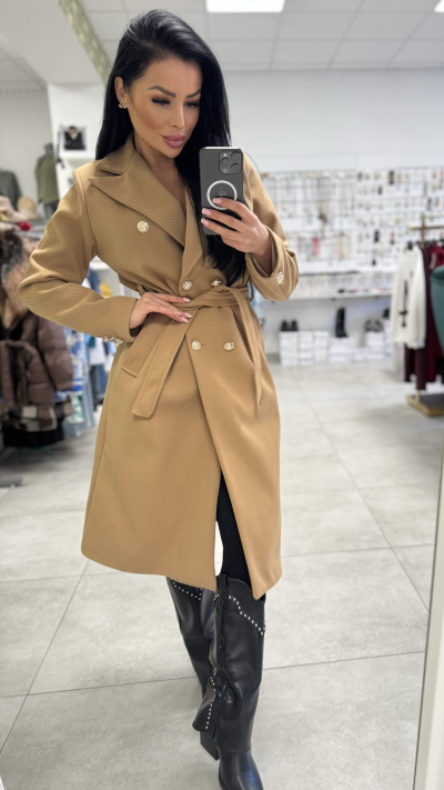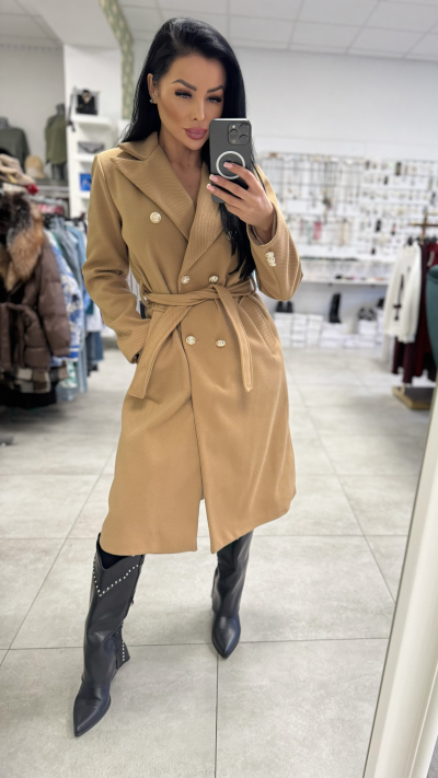 Dámsky štýlový trenčkot – karamelový odtieň (univerzálna veľkosť) Elegantný trenčkot v nadčasovom karamelovom odtieni, ktorý dokonale doplní váš jesenný či jarný outfit. Kabát má dvojradové zapínanie na zlaté gombíky a opasok v páse, vďaka ktorému krásne zvýrazní ženskú siluetu. Vyrobený z príjemného, kvalitného materiálu, ktorý drží tvar a pôsobí luxusne. Vhodný na bežné nosenie aj do práce či na spoločenské príležitosti. Detaily produktu: • Farba: karamelová / camel • Strih: viazanie v páse, dvojradové zapínanie • Dĺžka: po kolená • Materiál: mäkká tkanina s jemnou štruktúrou • Veľkosť: univerzálna (vhodná pre S – L) • Zapínanie: gombíky + opasok • Vrecká po bokoch Štýlový tip: Skombinujte ho s vysokými čižmami alebo elegantnými lodičkami pre dokonalý ženský look.