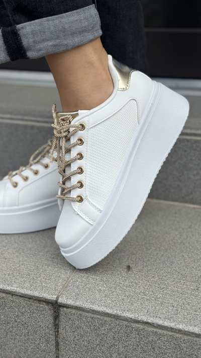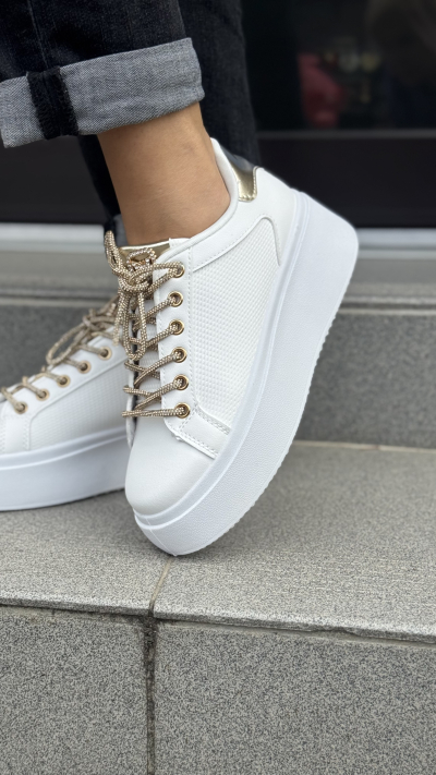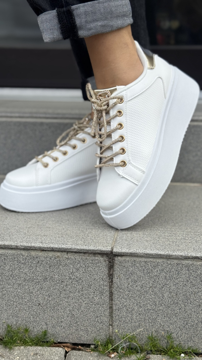 Dámske tenisky v bielom prevedení. Tenisky sú na platforme. Predná časť je na šnurovanie. Tenisky sedia podľa veľkosti.