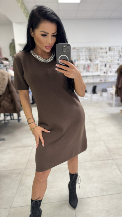 Úpletové šaty s kamienkovým detailom – hnedá farba