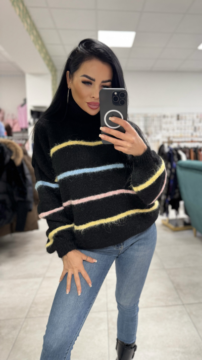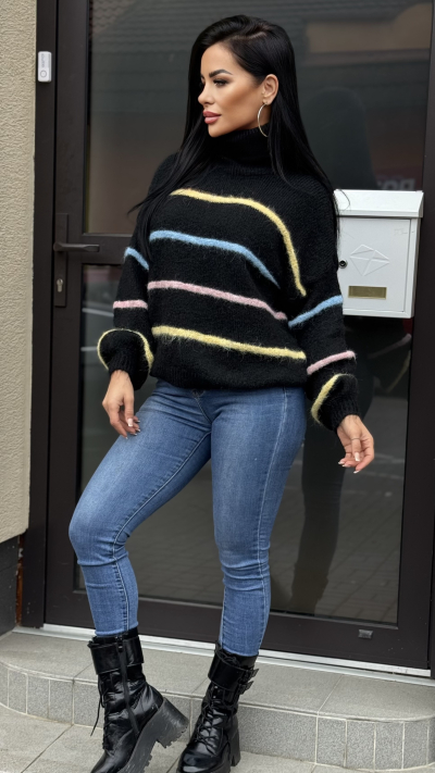 Dámsky rolákový sveter – čierny s farebnými pruhmi (UNI) Štýlový a výrazný rolákový sveter v čiernej farbe s jemnými farebnými pruhmi v žltej, ružovej a svetlomodrej. Tento kúsok je vyrobený z vysoko kvalitného, mäkkého a hrejivého materiálu, ktorý je príjemný na dotyk a komfortný na celodenné nosenie. Sveter má moderný oversize strih, dlhé rukávy a vyšší rolák, ktorý poskytuje maximálne teplo počas chladných dní. Farebné pruhy dodávajú sveteru mladistvý a svieži vzhľad. Univerzálna veľkosť sa prispôsobí rôznym typom postavy a krásne sadne na S až XL. ✔ UNIVERZÁLNA VEĽKOSŤ (UNI) Vhodný približne pre veľkosti S–XL. Materiál: vysokokvalitná mäkká pletenina Farby: čierna základ, žlté, ružové a modré pruhy Strih: oversize, rolák, dlhé rukávy Perfektný k rifliam aj sukni – teplý, pohodlný a štýlový kúsok, ktorý nesmie chýbať v zimnom šatníku.