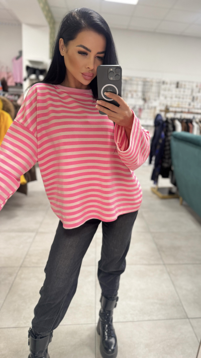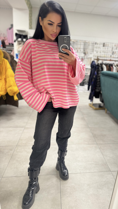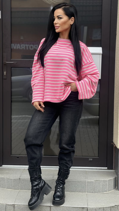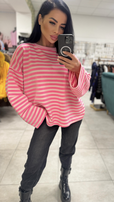 Dámska pruhovaná mikina – ružová Pohodlná a štýlová dámska mikina s výrazným pruhovaným vzorom v ružových tónoch. Voľný, mierne oversized strih zabezpečuje maximálny komfort a ležérny vzhľad. Mikina má okrúhly výstrih a dlhé, široké rukávy, ktoré dodávajú modelu moderný a trendový charakter. Príjemný, mäkký materiál je ideálny na každodenné nosenie – či už k rifliam, legínam alebo koženkovým nohaviciam. Skvelá voľba na bežný deň, do mesta aj na voľnočasové aktivity. Detaily: • pruhovaný dizajn • voľný/oversized strih • okrúhly výstrih • dlhé široké rukávy • mäkký a pohodlný materiál Farba: ružová Štýl: casual, trendy