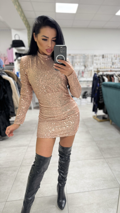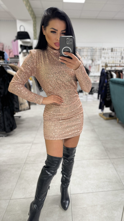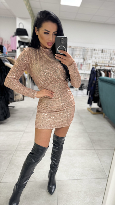 Elegantné a zároveň výrazné mini šaty, ktoré zaručene pritiahnu pozornosť. Trblietavý materiál v jemnom ružovo-zlatom odtieni dodáva šatám luxusný vzhľad, zatiaľ čo priliehavý strih krásne zvýrazní ženské krivky. Vysoký golier a dlhé rukávy robia tento model ideálnym na večerné príležitosti, oslavy či spoločenské udalosti.