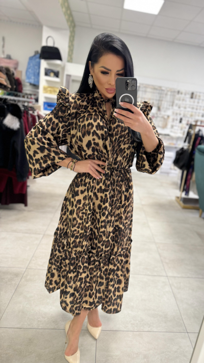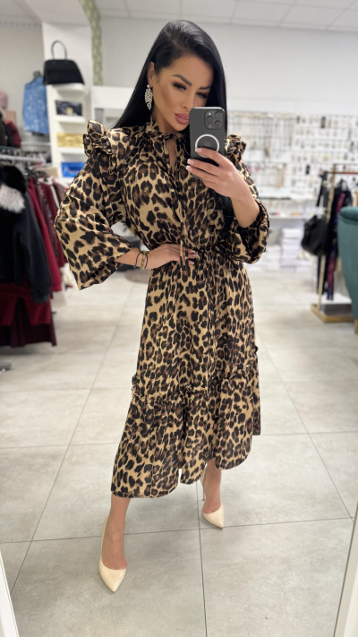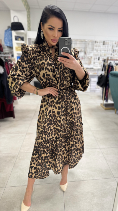 Luxusné, dámske šaty v leoparďom prevedení. Šaty sú v univerzálnej veľkosti. Vyrobené z vysoko kvalitného materiálu. Majú opasok na previazanie, ktorým si perfektne vytvarujete postavu. Šaty pôsobia luxusne vkusne a zároveň elegantne.