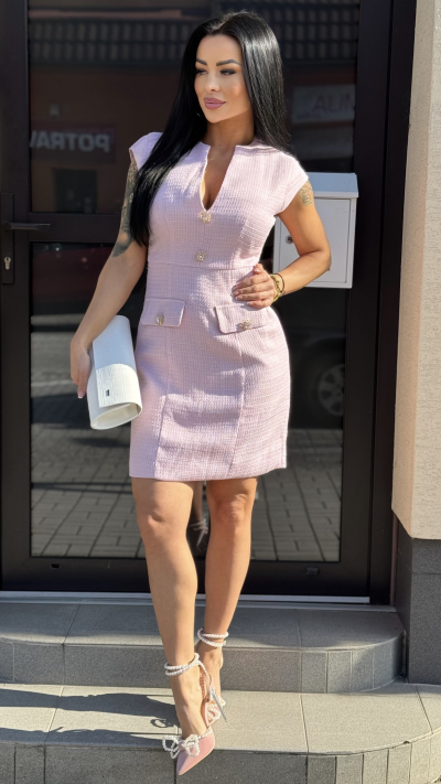 Elegantné dámske šaty v jemnej ružovej farbe, ktoré pôsobia luxusne a zároveň veľmi žensky. Model má priliehavý strih, ktorý krásne zvýrazní postavu. Šaty sú bez rukávov s jemne tvarovanými ramenami a hlbším V-výstrihom, ktorý opticky predĺži siluetu. Prednú časť zdobia výrazné zlaté ozdobné gombíky a dekoratívne klopové vrecká, ktoré dodávajú modelu sofistikovaný, mierne „chanel“ štýl. Materiál má jemnú štruktúru, pôsobí pevne a kvalitne, vďaka čomu šaty držia tvar. Ideálne na spoločenské udalosti, oslavy, pracovné stretnutia či elegantný večer. Skvele sa kombinujú s lodičkami aj sandálmi na podpätku. Dostupné veľkosti: S, M, L.