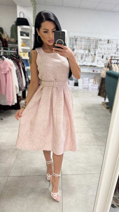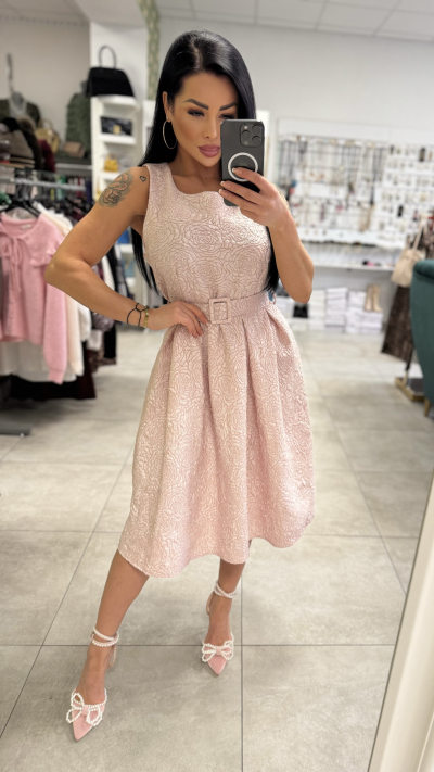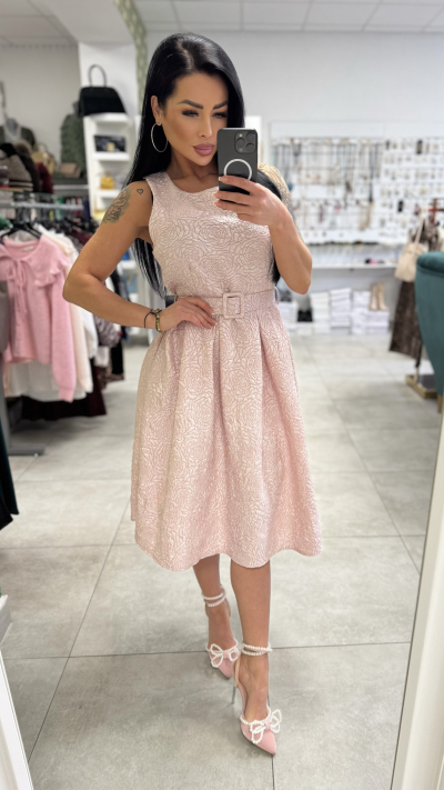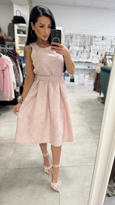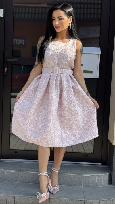 Elegantné dámske šaty v jemnej púdrovo-ružovej farbe s romantickým plastickým vzorom. Model má priliehavý vrch bez rukávov s okrúhlym výstrihom a zvýraznený pás pomocou opasku s decentnou prackou, ktorý krásne vytvaruje siluetu. Sukňa je bohato riasená, áčkového strihu, s midi dĺžkou, vďaka čomu pôsobí veľmi žensky a elegantne. Pevnejší materiál drží tvar a vytvára krásny objem. Šaty sú ideálne na svadby, oslavy, rodinné udalosti, stužkové či elegantné večierky. Stačí doplniť lodičkami alebo sandálmi na podpätku a vytvoríte dokonalý spoločenský outfit. Veľkosť: UNI (sadne približne na S – M).