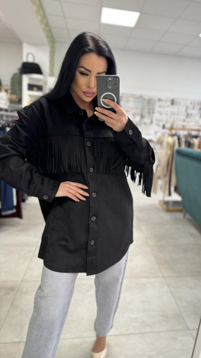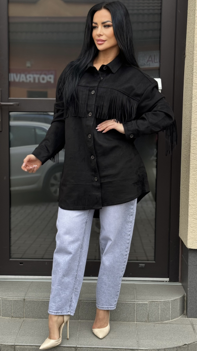 Štýlová prechodná bunda v trendy košeľovom strihu, ktorá skvele doplní každý outfit. Model je navrhnutý v minimalistickej čiernej farbe s výraznými strapcami na prednej časti a rukávoch, ktoré dodávajú celku moderný a originálny vzhľad.
