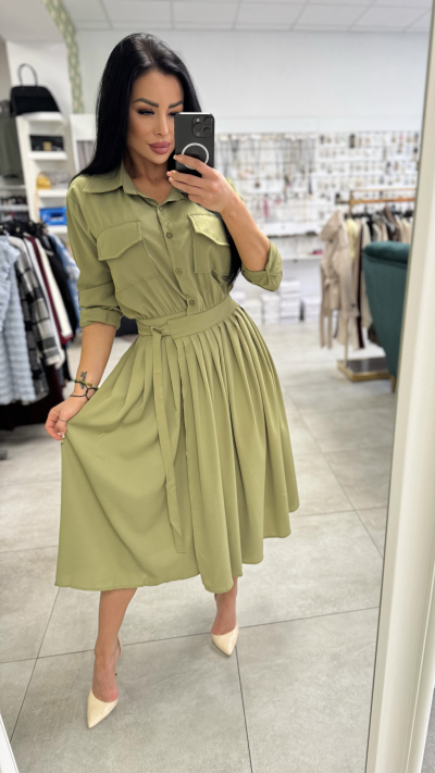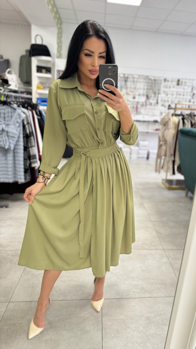 Nadčasové šaty v jemnej bledej kaki farbe, ktoré pôsobia veľmi elegantne a žensky. Vrchná časť je inšpirovaná košeľovým štýlom – doplnená klasickým límčekom a zapínaním vpredu, čo dodáva modelu upravený a sofistikovaný vzhľad.