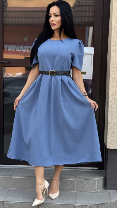 Šaty majú midi dĺžku, krásne padavý áčkový strih a krátke rukávy s jemným objemom, ktoré dodávajú modelu romantický nádych. Zvýraznený pás (možnosť doplniť opaskom) krásne formuje postavu a lichotí každej siluete. Kvalitný, príjemný materiál zabezpečuje pohodlie počas celého dňa.