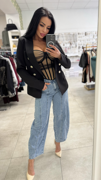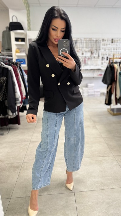 Elegantne dámske sako v čiernej farbe. Sako je zdobené krásnymi zlatými gombíkmi. Perfektný kúsok vhodný na bežné nosenie, ale i slávnostné príležitosti.