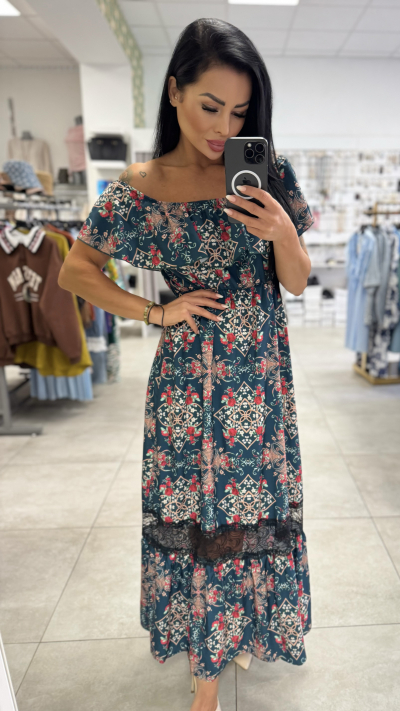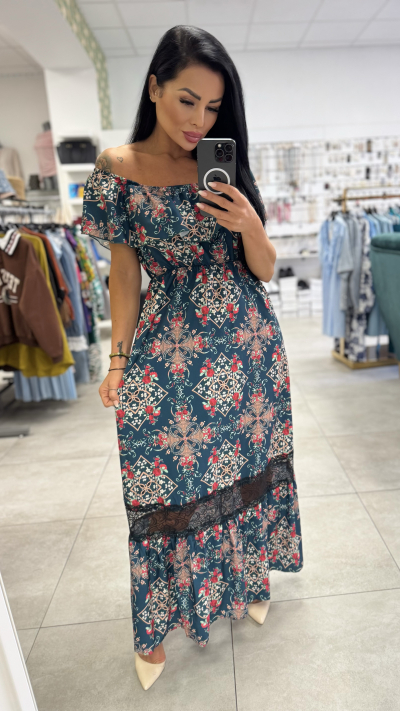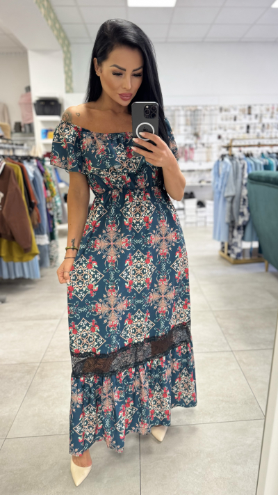 Dámske maxi šaty s off-shoulder strihom a čipkovým detailom Elegantné maxi šaty v boho štýle s jemným off-shoulder výstrihom, ktorý nechá vyniknúť ramená. Pestrofarebný kvetinovo-ornamentálny vzor na tmavomodrom podklade dodáva šatám jedinečný a živý charakter. V páse sú jemne stiahnuté gumičkou pre pohodlné nosenie a zvýraznenie siluety. Spodná časť šiat je ozdobená čiernou čipkou a volánovým lemom, čo im dodáva romantický nádych. Materiál: ľahký a vzdušný (ideálny na leto) Strih: voľný, maxi dĺžka Farba: tmavomodrá s viacfarebným vzorom Detail: čipkový pruh nad spodným volánom Vhodné na: letné prechádzky, dovolenky, oslavy aj bežné nosenie