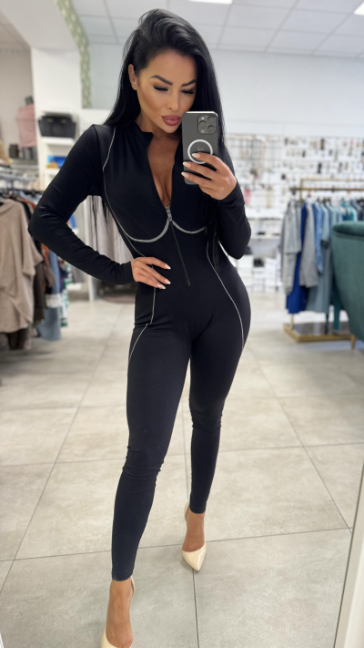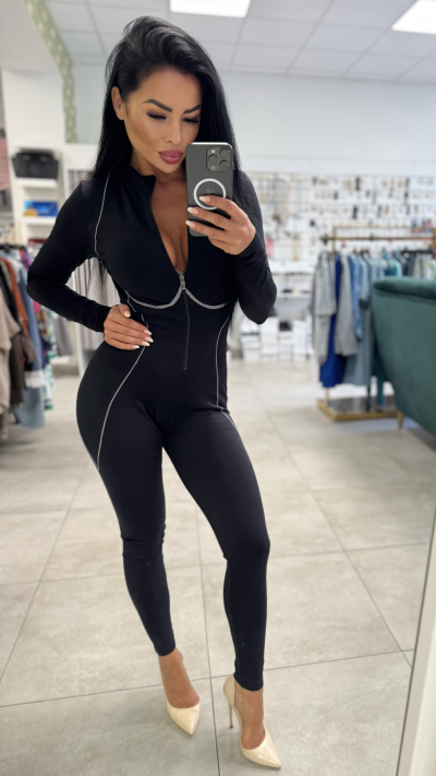 Dámsky čierny overal na zips Štýlový priliehavý overal, ktorý dokonale zvýrazní vašu postavu. Vyrobený z elastického materiálu pre maximálne pohodlie a voľnosť pohybu. Biele dekoratívne švy dodávajú moderný a športovo-elegantný vzhľad. Praktický zips vpredu umožňuje jednoduché obliekanie a zároveň pôsobí trendovo. • Farba: čierna s bielymi švami • Materiál: elastická zmes (prispôsobí sa postave) • Strih: slim fit, dlhé rukávy, dlhé nohavice • Detail: predný zips • Vhodný na: voľný čas, párty aj bežné nosenie Doplnok v podobe elegantných lodičiek alebo tenisiek premení tento overal na ideálny outfit na každú príležitosť.