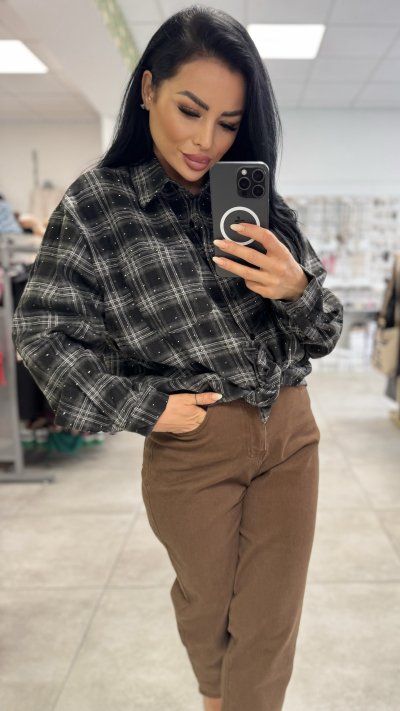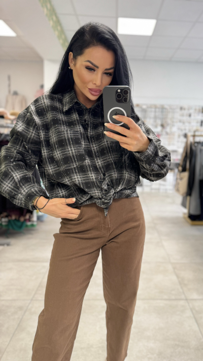 Čierna károvaná košeľa, ktorú máš na fotke, pôsobí veľmi štýlovo a zároveň pohodlne. ✨ • Dizajn: klasický čierny károvaný vzor, ktorý je posiaty drobnými kamienkami – tie jej dodávajú jemný lesk a originálny vzhľad. • Strih: klasický, zapínanie vpredu na gombíky. Dá sa nosiť voľne, zaviazaná v páse alebo zasunutá do nohavíc. • Materiál: vyrobená z vysokokvalitnej, príjemnej látky, ktorá zaručuje komfort pri nosení. • Veľkosti: dostupná v dvoch variantoch – S/M a L/XL. Hodí sa na bežné nosenie, ale vďaka kamienkom aj na večer do mesta alebo na neformálne spoločenské akcie.