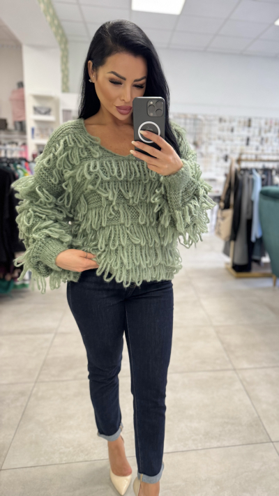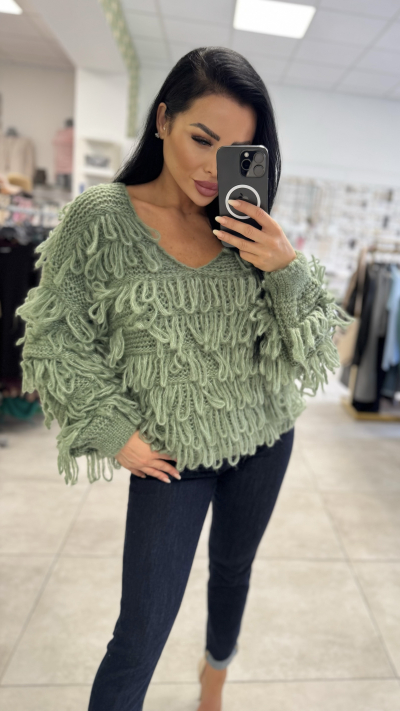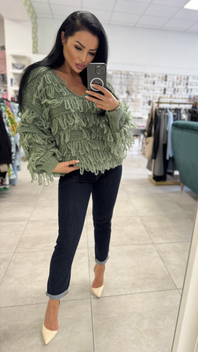 Dámsky sveter s ozdobnými slučkami – zelený Veľkosť: UNI Originálny dámsky sveter v jemne olivovo-zelenej farbe, ktorý zaujme na prvý pohľad. Je pletený z príjemného, mäkkého materiálu a zdobený výraznými slučkami po celom povrchu, čo mu dodáva moderný a hravý vzhľad. Má voľnejší strih, ktorý sa pohodlne prispôsobí postave a pôsobí ležérne. Výstrih do „V“ opticky predlžuje postavu a dodáva ženskosť. Detaily: • Trendový dizajn so slučkami po celom svetríku • Výstrih do „V“ • Elastické zakončenie rukávov a spodného lemu • UNI veľkosť – vhodná pre S, M aj L • Mäkký, hrejivý a pohodlný na nosenie Tip na styling: Skombinuj ho s džínsami a lodičkami pre štýlový mestský look alebo s legínami a teniskami na ležérne nosenie.