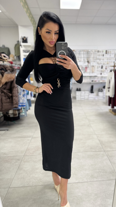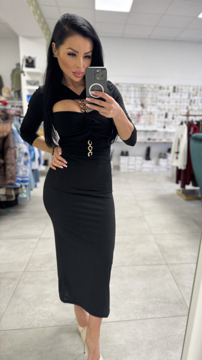 Štýlové dámske šaty v čiernom prevedení. Šaty sú s dlhým rukávov. Predná časť je tvorená výstrihom a zlatou dekoráciu. Veľmi vkusný sexy kúsok, ktorý sa hodí na rôzne príležitosti.