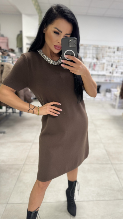 Úpletové šaty s kamienkovým detailom – hnedá farba