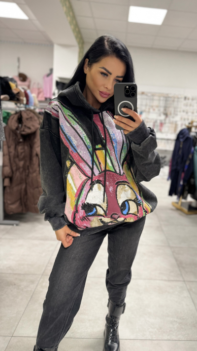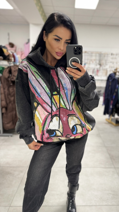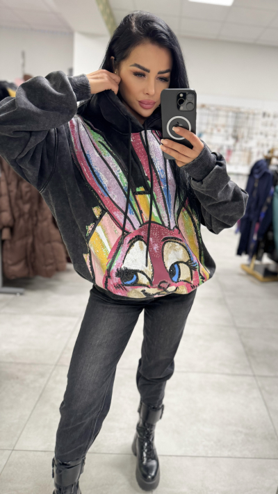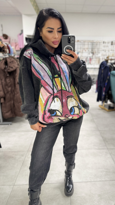 Dámska mikina v univerzálnej veľkosti v krásnom prevedení. Mikina je vyrobená z vysoko kvalitného materiálu. Mikina má kapucu. Vpredu je krásny obrázok zajačika.