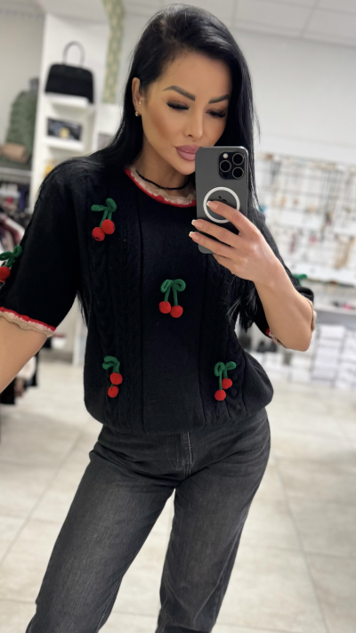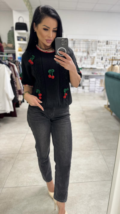 Štýlový, dámsky sveter univerzálne veľkosti. Sveter je zdobený 3-D čerešňami. Perfektný kúsok vhodný na jar.