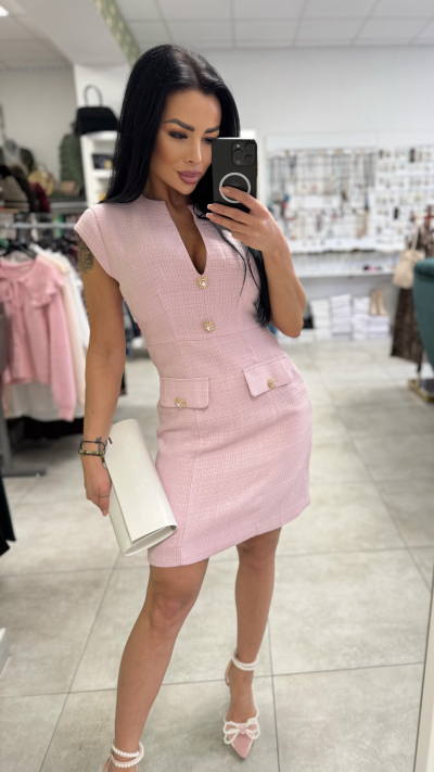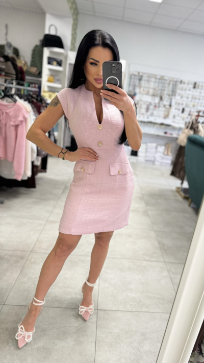 Elegantné dámske šaty v jemnej ružovej farbe, ktoré pôsobia luxusne a zároveň veľmi žensky. Model má priliehavý strih, ktorý krásne zvýrazní postavu. Šaty sú bez rukávov s jemne tvarovanými ramenami a hlbším V-výstrihom, ktorý opticky predĺži siluetu. Prednú časť zdobia výrazné zlaté ozdobné gombíky a dekoratívne klopové vrecká, ktoré dodávajú modelu sofistikovaný, mierne „chanel“ štýl. Materiál má jemnú štruktúru, pôsobí pevne a kvalitne, vďaka čomu šaty držia tvar. Ideálne na spoločenské udalosti, oslavy, pracovné stretnutia či elegantný večer. Skvele sa kombinujú s lodičkami aj sandálmi na podpätku. Dostupné veľkosti: S, M, L.