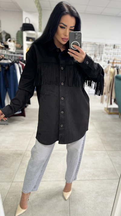 Štýlová prechodná bunda v trendy košeľovom strihu, ktorá skvele doplní každý outfit. Model je navrhnutý v minimalistickej čiernej farbe s výraznými strapcami na prednej časti a rukávoch, ktoré dodávajú celku moderný a originálny vzhľad.