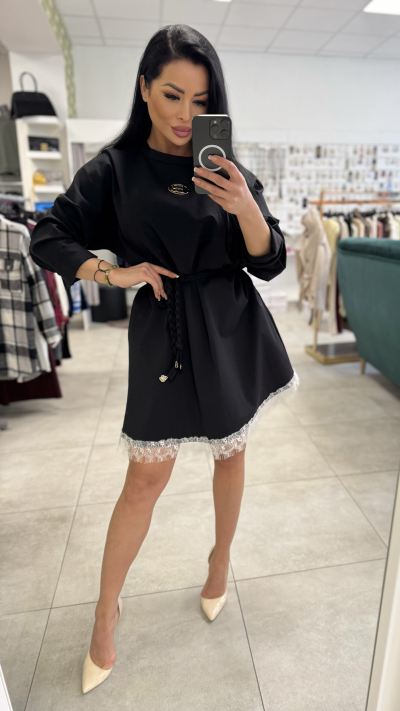 Štýlové čierne šaty z kvalitného teplákového materiálu, ktoré spájajú pohodlie a moderný vzhľad. Voľnejší strih dopĺňa praktický opasok v páse, vďaka ktorému si šaty jednoducho prispôsobíš podľa postavy.