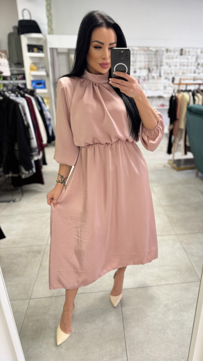 Dominantou modelu je vyšší golier a dlhé rukávy zakončené jemnou gumičkou, ktoré dodávajú šatám sofistikovaný a moderný vzhľad. Ľahký, splývavý materiál pôsobí elegantne a príjemne sa nosí počas celého dňa.