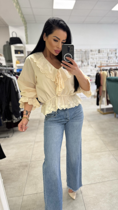 Táto krásna krémová blúzka zaujme na prvý pohľad svojimi detailmi. Dominantou je bohato zdobený golier s jemnou čipkou a viazaním pri krku, ktorý pôsobí veľmi žensky a sofistikovane. Ľahký, vzdušný materiál zabezpečuje maximálne pohodlie počas celého dňa.