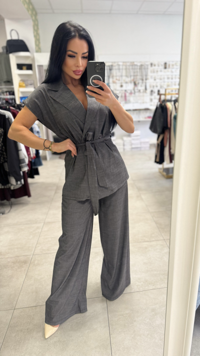 Elegantný a zároveň veľmi štýlový komplet v krásnom sivom prevedení. Komplet je v univerzálnej veľkosti. Nohavice sú páse na gumu. Vesta je s viazaním, čím si ju pekne prispôsobíte na postavu. Perfektný kúsok vhodný na slávnostné príležitosti