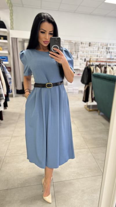 Šaty majú midi dĺžku, krásne padavý áčkový strih a krátke rukávy s jemným objemom, ktoré dodávajú modelu romantický nádych. Zvýraznený pás (možnosť doplniť opaskom) krásne formuje postavu a lichotí každej siluete. Kvalitný, príjemný materiál zabezpečuje pohodlie počas celého dňa.