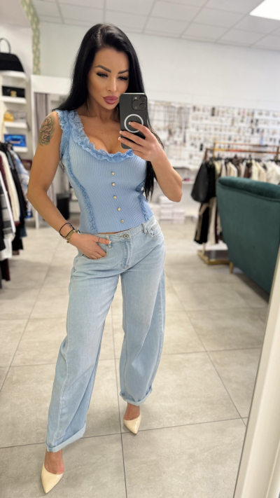 Štýlové, dámske tielko v bledomodrom prevedení. Tielko je vyrobené z vysoko kvalitného materiálu. Perfektný kúsok vhodný na bežné nosenie. Strih tielka je v romantickom štýle.