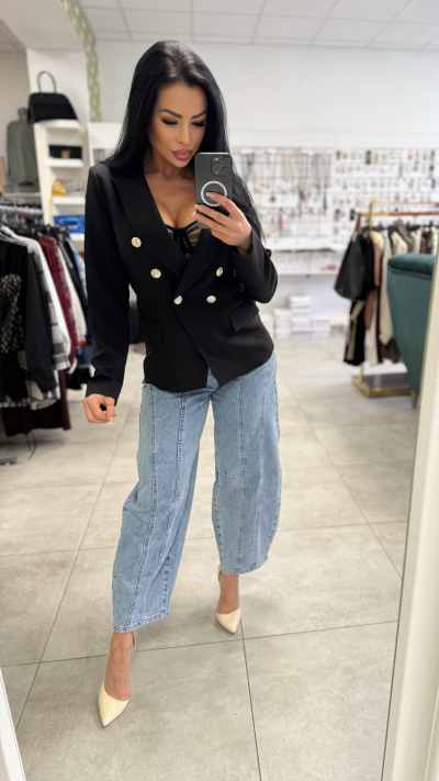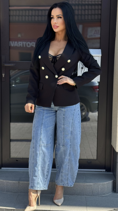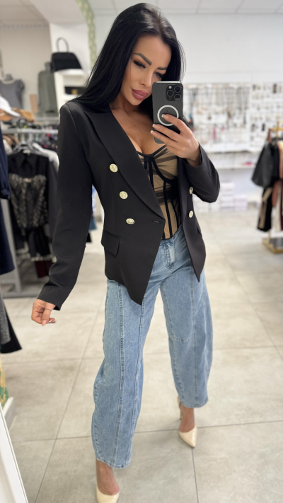 Elegantne dámske sako v čiernej farbe. Sako je zdobené krásnymi zlatými gombíkmi. Perfektný kúsok vhodný na bežné nosenie, ale i slávnostné príležitosti.